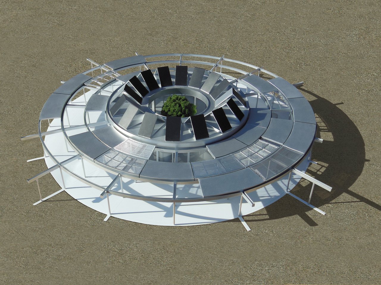 La casa interactiva con anillos concéntricos diseñada por Michael Jantzen convierte la idea del hogar en un ecosistema vivo. El concepto radical presenta un gran roble plantado en un patio central abierto rodeado por cuatro anillos de acero concéntricos que sostienen paredes corredizas de vidrio, sombrillas móviles, paneles solares y espacios habitables totalmente flexibles.