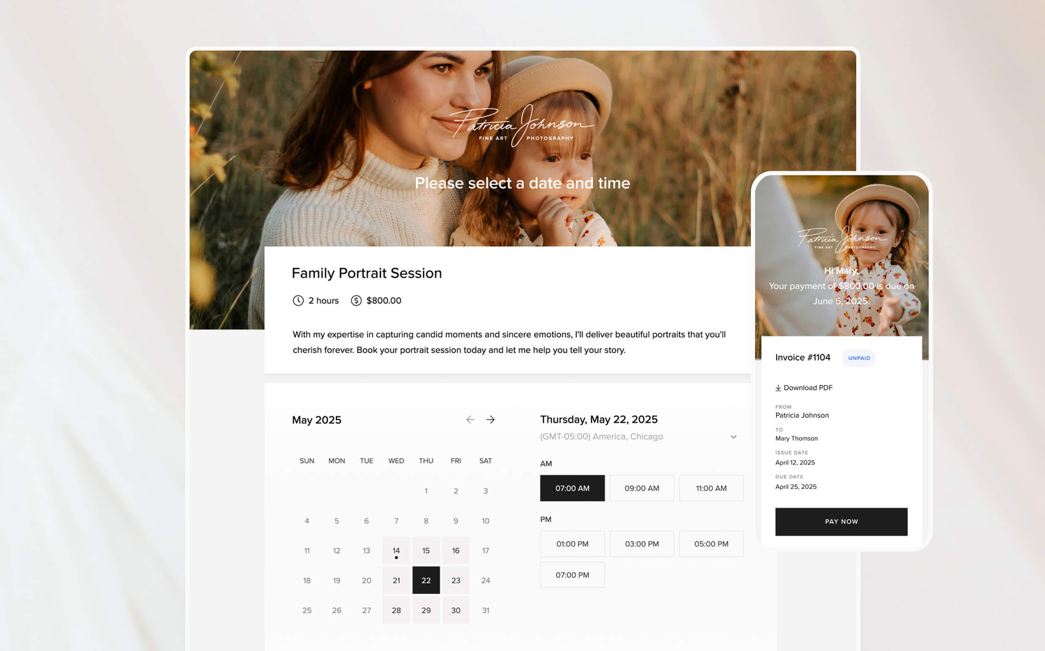 Las herramientas de reserva y programación de Studio Manager cambian la forma en que los fotógrafos protegen sus sesiones. Los fotógrafos pueden crear horarios de sesiones completos o pequeños dentro de la plataforma, así como reservar consultas telefónicas y por vídeo. El sistema de reservas permite a los usuarios establecer disponibilidad, políticas de cancelación y tiempos de reserva para garantizar que las reuniones se ajusten a su agenda. Los clientes pueden ver los servicios y reservar directamente desde el calendario en línea, lo que reduce el intercambio de correos electrónicos. Al integrar formularios de pago y cobro en el flujo de trabajo de reservas, los fotógrafos pueden cobrar depósitos o tarifas completas de la sesión por adelantado, asegurando reservas con un mínimo esfuerzo. Este proceso simplificado garantiza que los fotógrafos dediquen menos tiempo a coordinar y más tiempo a tomar fotografías.