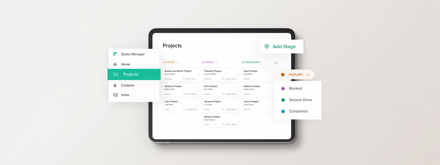 La función Proyectos de Studio Manager ayuda a los fotógrafos a mantenerse organizados permitiéndoles gestionar el trabajo de los clientes en un tablero visual. Pueden realizar un seguimiento de los proyectos por fase, asignar clientes y vincular documentos y reuniones relacionados. Esta función garantiza que no se pierda ninguna tarea y proporciona una descripción clara del trabajo en curso y futuro. Por ejemplo, un fotógrafo puede monitorear un proyecto de boda desde la consulta inicial hasta la entrega final en la galería, asegurando que cada paso se complete de manera eficiente.