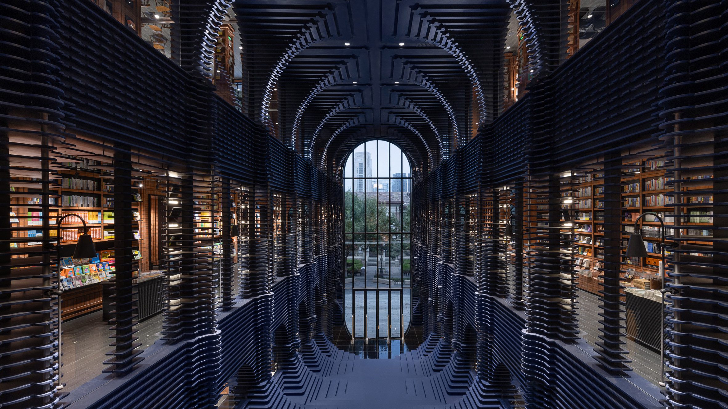 Listones de acero forman estanterías escultóricas en la librería Tianjin Zhongshuge