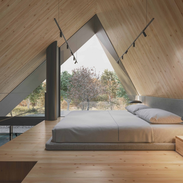 Además de las funciones auxiliares, el loft de planta abierta alberga el área de dormitorio, haciendo un uso eficiente del espacio compacto y adecuado para una vida a corto plazo.