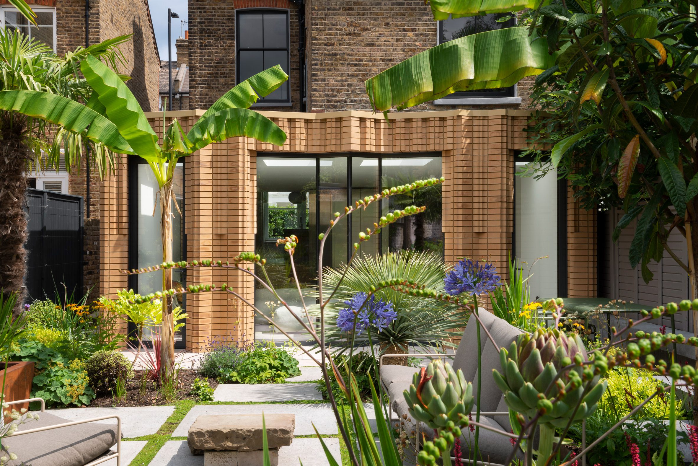 La extensión trasera alberga un espacio habitable iluminado por tragaluces y vidrios plegables en ángulo con vistas a los jardines a ambos lados.