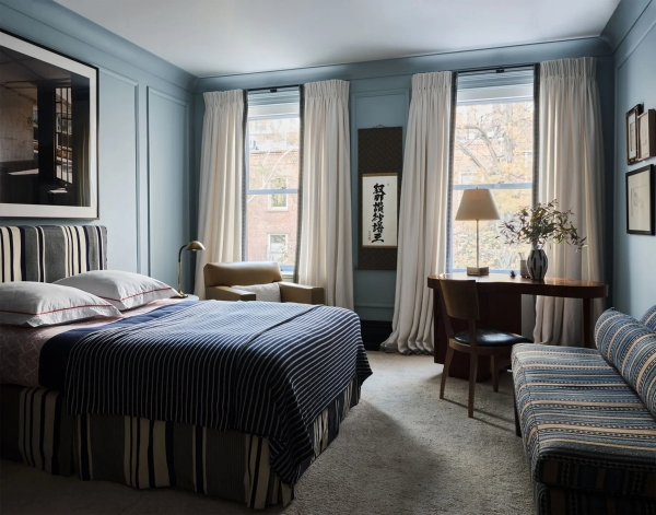 En la suite principal, los textiles en colores pastel y las cortinas de seda suavizan la geometría del artesonado.