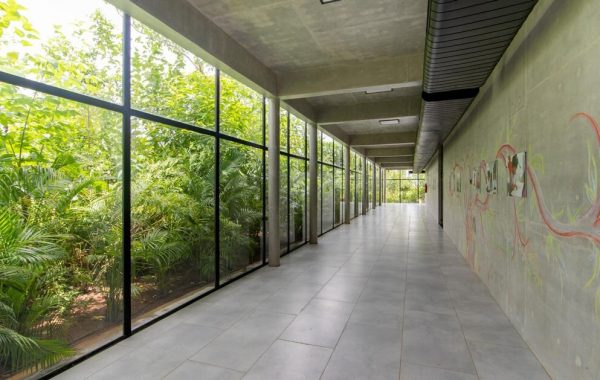 A nivel del suelo, se despliega un jardín desde la cafetería del museo, diseñado con sutiles cambios topográficos para dirigir el agua de lluvia hacia las áreas de recolección. El sistema reduce la dependencia de fuentes de agua externas y sustenta la vegetación que suaviza el perímetro del edificio. El paisaje y la arquitectura se conciben como una superficie continua, cada uno de los cuales se apoya al otro a través de medios económicos.