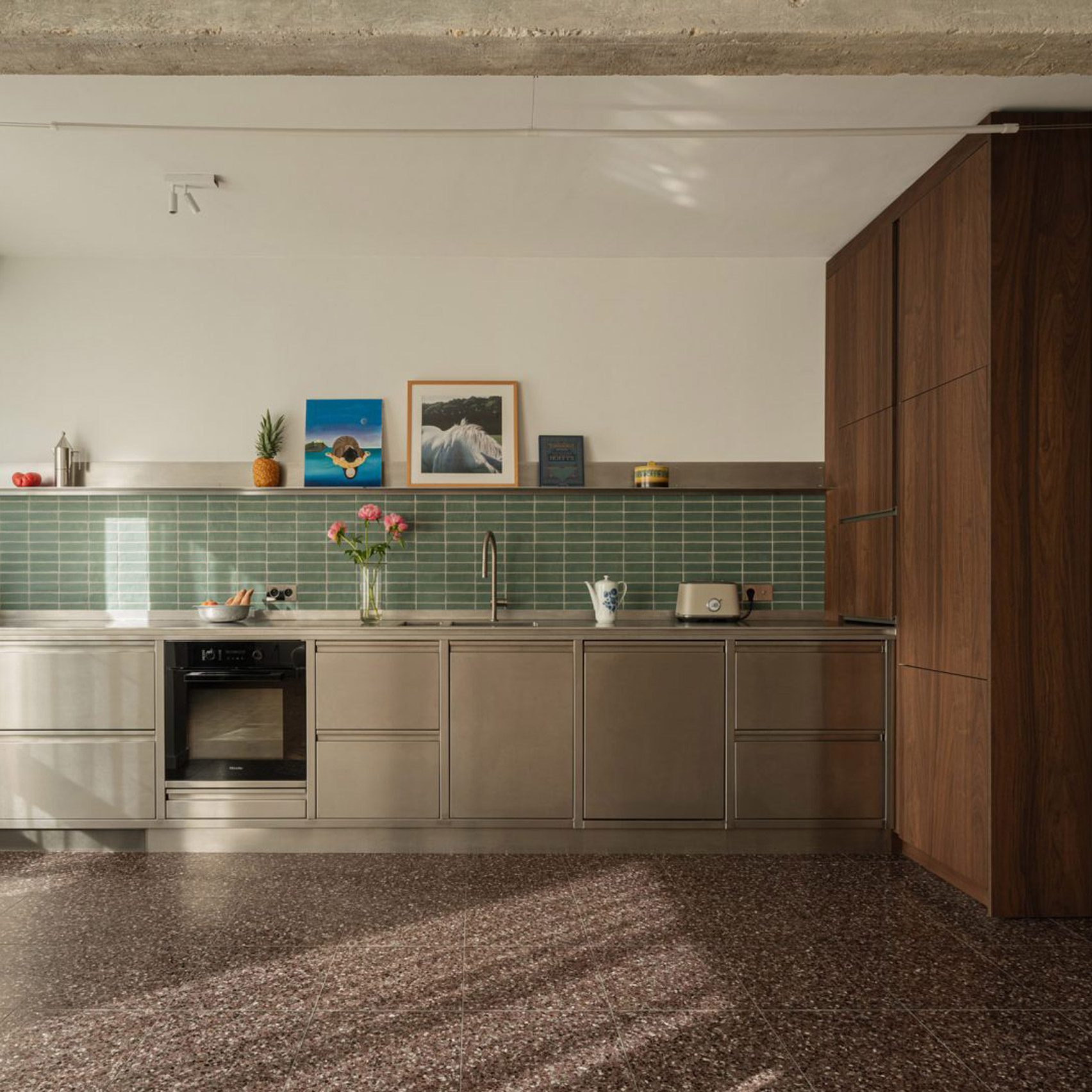 La cocina está justo al frente, delimitada por un piso de terrazo color burdeos. Cuenta con gabinetes de acero inoxidable y un estante delgado de acero sobre un protector contra salpicaduras de azulejos verdes, donde los propietarios pueden exhibir pequeñas obras de arte o utensilios de cocina.