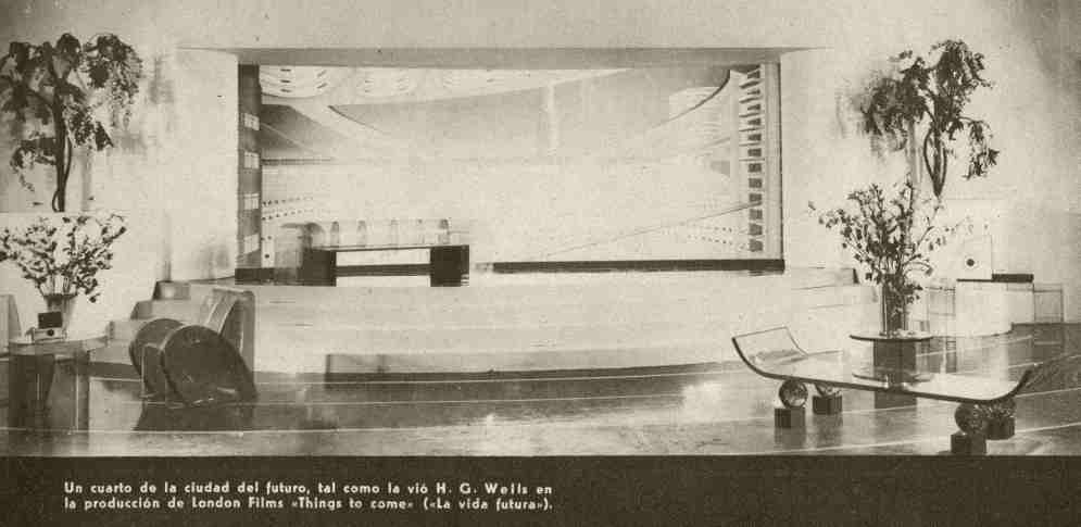 Las imágenes de este artículo incluyen tres reproducciones de interiores domésticos: el colorido comedor de la casa Raymond Masseydormitorio «moderno» Margarita Scott y una estancia de película ¿Qué está por pasar?dirigido por William Cameron MenziesLa película tuvo su estreno mundial el 21 de febrero del mismo año y aún no se había estrenado en España, donde se estrenó el 5 de noviembre de 1937. Aunque parezca mentira, tanto Macy como Scott son los protagonistas de la película.