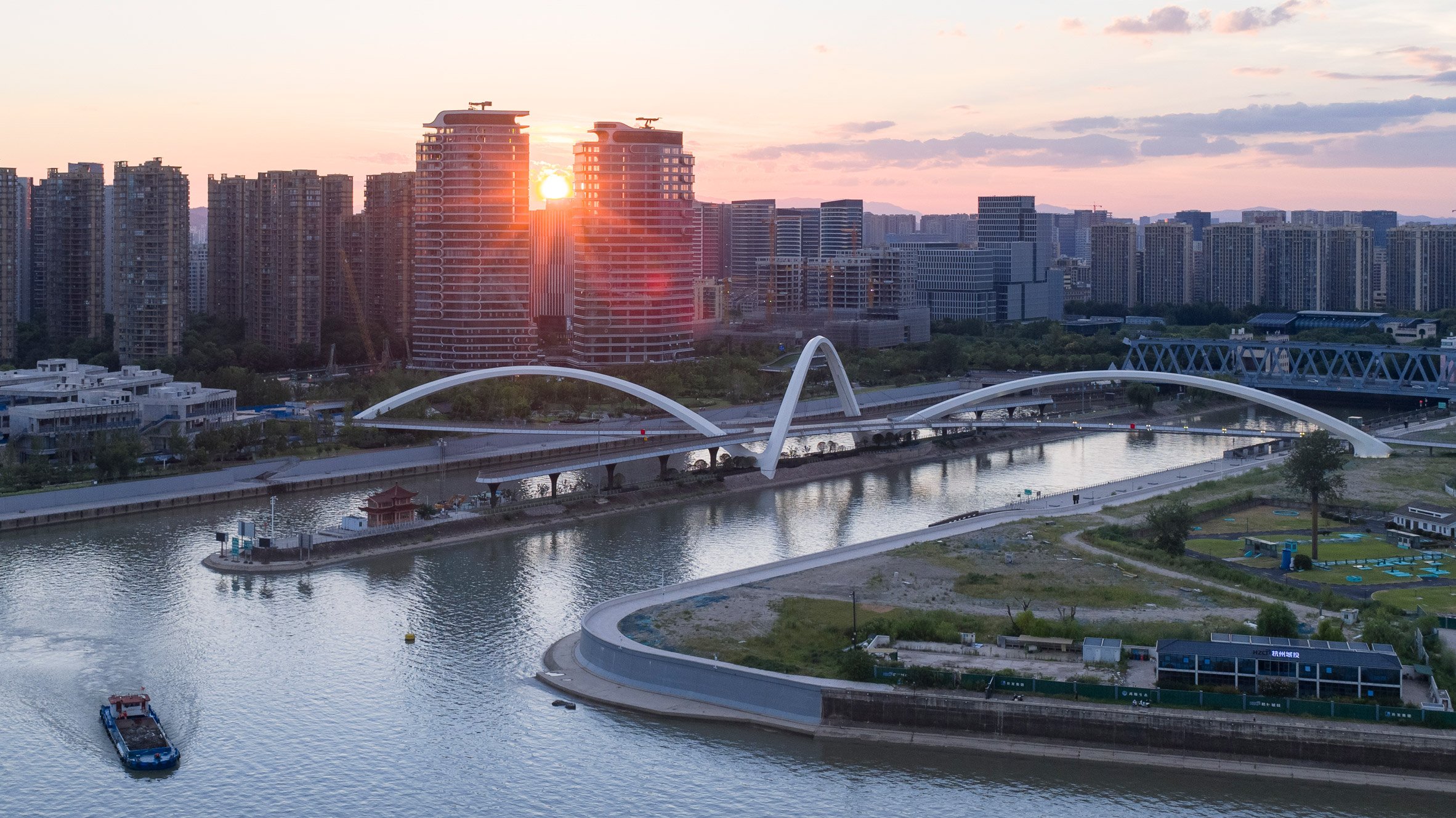 Zaha Hadid Architects se basó en la historia del bordado de seda de Hangzhou para crear tres arcos blancos que cruzan el Puente del Gran Canal.