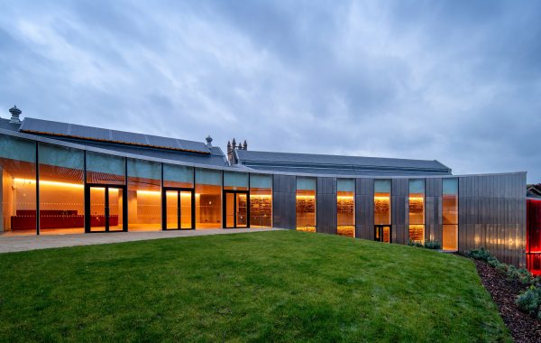 En la sala de estar, una chimenea oscura está anclada a la pared del fondo y su tono hace eco sutilmente del exterior negro de la casa. Enormes ventanas enmarcan el paisaje circundante, mientras que el vidrio del piso al techo en la cocina y la sala de estar permite que la luz natural llene el espacio.