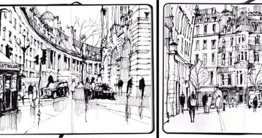 Cuaderno de bocetos en tinta de dibujos arquitectónicos de Londres.