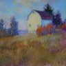Estas luces de las copas de los árboles me llamaron la atención, así que tomé algunas fotos desde el asiento del pasajero de mi auto. Los colores del otoño son difíciles de lograr y sé que no son del todo correctos, pero tal vez me acerque al efecto de iluminación que quiero. Tomé prestados campos de ambos lados para rellenar el camino. Acrílico 9×9 sobre papel de acuarela.