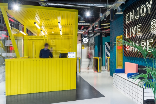 El proyecto encarna una estética ecléctica mediterránea audaz para la vida y la colaboración de los estudiantes. El edificio de aproximadamente 26,900 pies cuadrados contiene 97 habitaciones para estudiantes con cocinas compartidas y áreas comunes arriba.