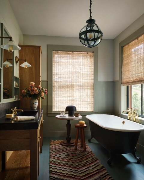 El baño principal utiliza una bañera independiente, una paleta simple de accesorios y materiales táctiles.