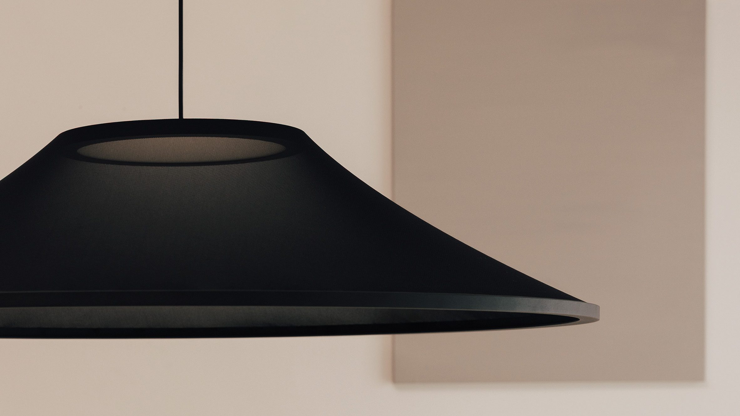 El estudio de diseño Geckeler Michels colabora con la marca española akoslet La pantalla de la lámpara colgante está hecha de tela negra elástica que se tensa por la gravedad.
