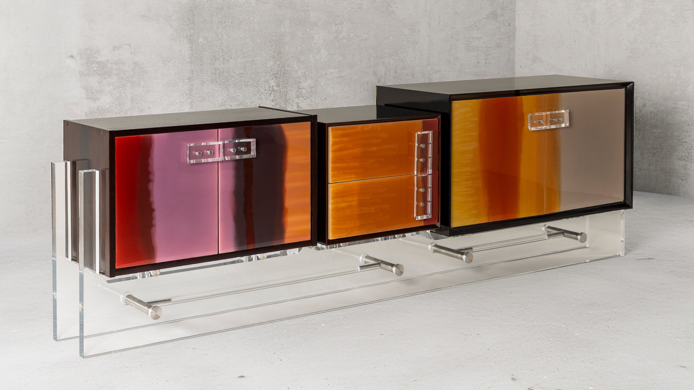 Stendhal es una mesa consola arquitectónica hecha de resina de color rubí sostenida por dos patas columnares de hormigón, mientras que Rescue Me es un mueble bajo construido a partir de gabinetes de resina de colores que se asientan sobre una base transparente.