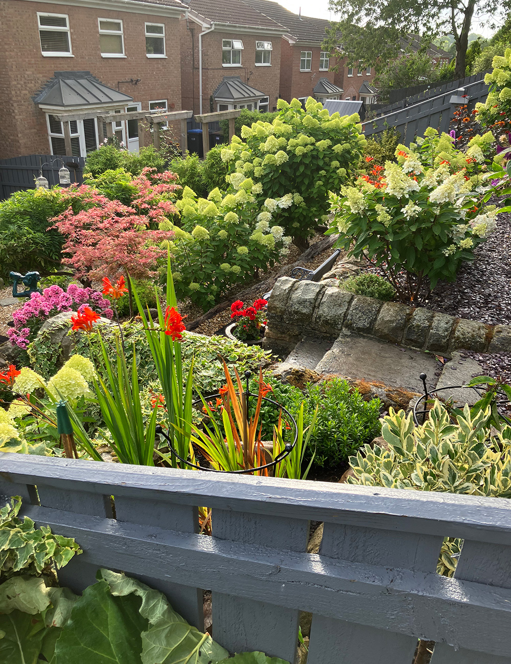Jardín inclinado con muchas flores.Un jardín inclinado trae una serie de nuevos obstáculos y desafíos, pero tiene un beneficio: es fácil crear un jardín exuberante, y la selección y ubicación de las plantas requiere un poco menos de pensamiento y estrategia. Peter podría optar por plantar algunas plantas más pequeñas en la parte posterior del parterre, como hortensias, que son mucho más compactas que los ejemplares más grandes de las capas inferiores, lo que no sería posible en un paisaje llano.