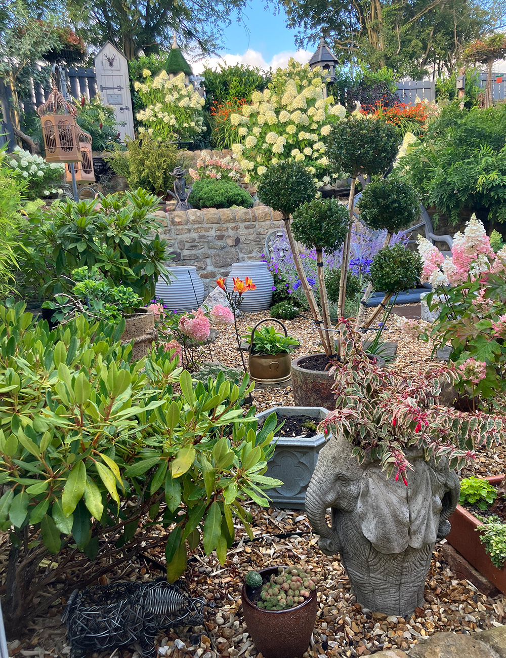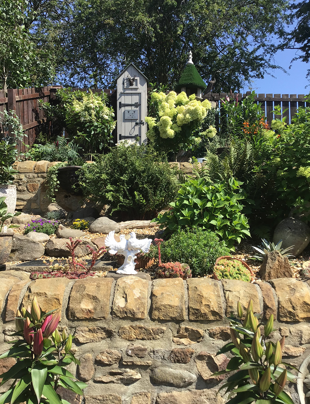 muro de contención en el jardínEstos muros de contención también brindan oportunidades más visibles para el arte del jardín, del que la cama de Peter estaba escasamente salpicada. También verá hermosas plantas en macetas repartidas por todo el jardín, aprovechando al máximo cada centímetro de espacio disponible para más plantas y personalidad.