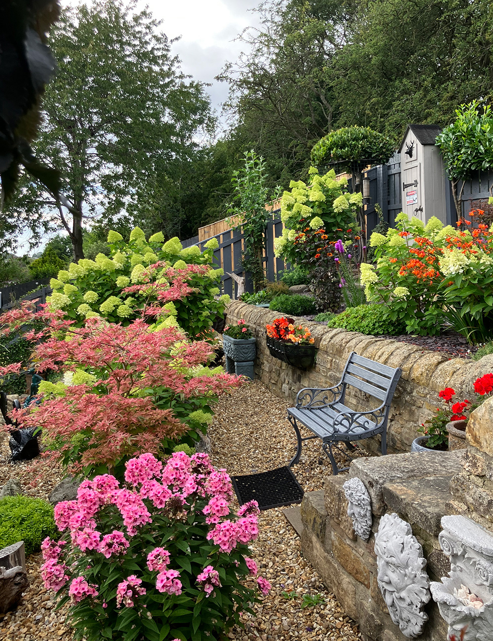 Flores rosadas y verdes en jardín inclinadoLos jardines de las cabañas están llenos de color, con muchas flores diferentes y vibrantes, y el jardín de Peter tiene casi todos los colores imaginables. Sin embargo, no solo se basó en las flores para crear este hermoso tono, sino que también usó el follaje para crear posibilidades botánicas aún más impresionantes, como un arce japonés rosado ubicado entre hortensias y floxes.
