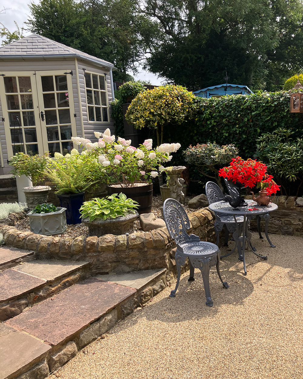 Zona de estar en el jardín cerca de las escalerasFinalmente, una pequeña y acogedora zona para sentarse rodeada de más contenedores de hermoso follaje y flores.