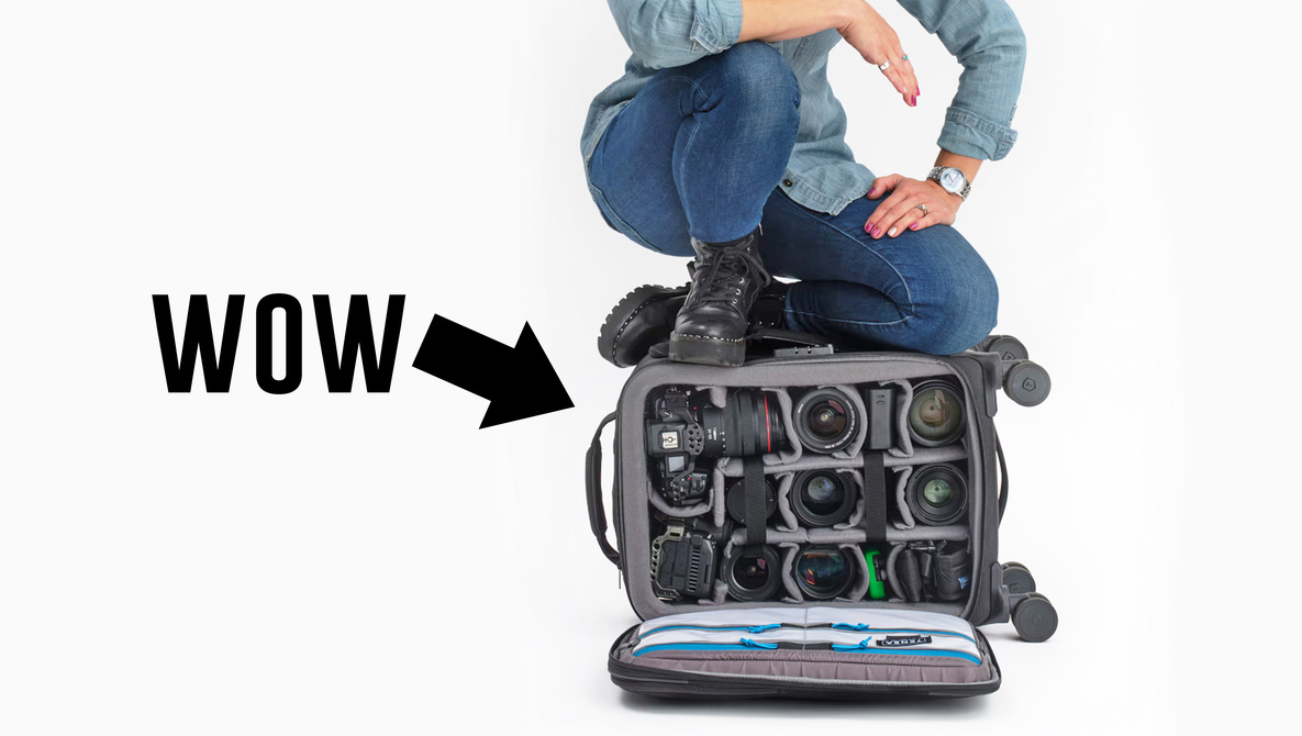En el interior, el diseño personalizable puede acomodar hasta tres cámaras de cine, DSLR o sin espejo, 10 lentes (hasta 600 mm), una computadora portátil de 16 pulgadas o incluso un kit de iluminación portátil. Los divisores ajustables de gancho y bucle mantienen tu equipo organizado, mientras que los bolsillos AirTag ocultos añaden seguridad moderna.