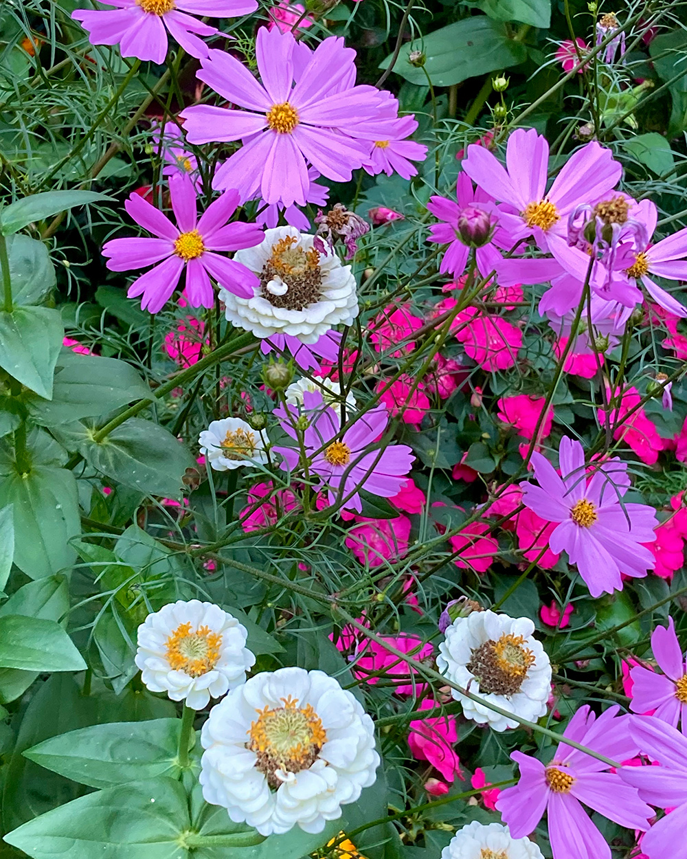 Heidi tiene bordes impresionantes llenos de fantásticas plantas perennes, pero el jardín de su patio se compone principalmente de una increíble mezcla de plantas anuales. blanco Zinnia y rosa universo Con el telón de fondo de impaciencias de color rosa brillante, es una escena celestial.