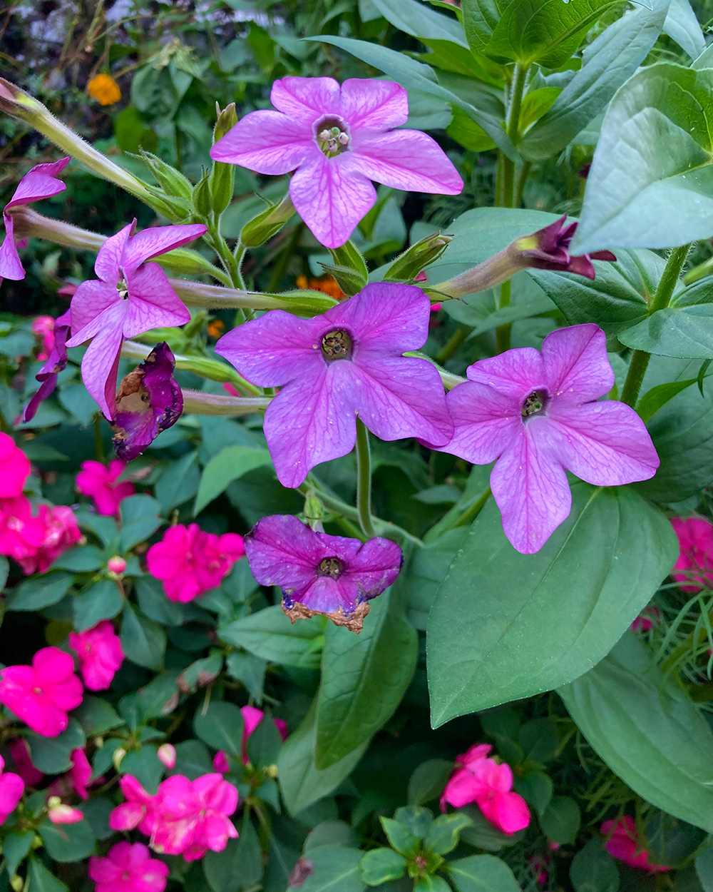 El tabaco en flor es una planta de floración larga que continúa floreciendo hasta el otoño (Nicotiana spp., anual), disponible en una variedad de colores. Este tono lila con texturas rosadas combina muy bien con el resto de la exhibición anual de Heidi.