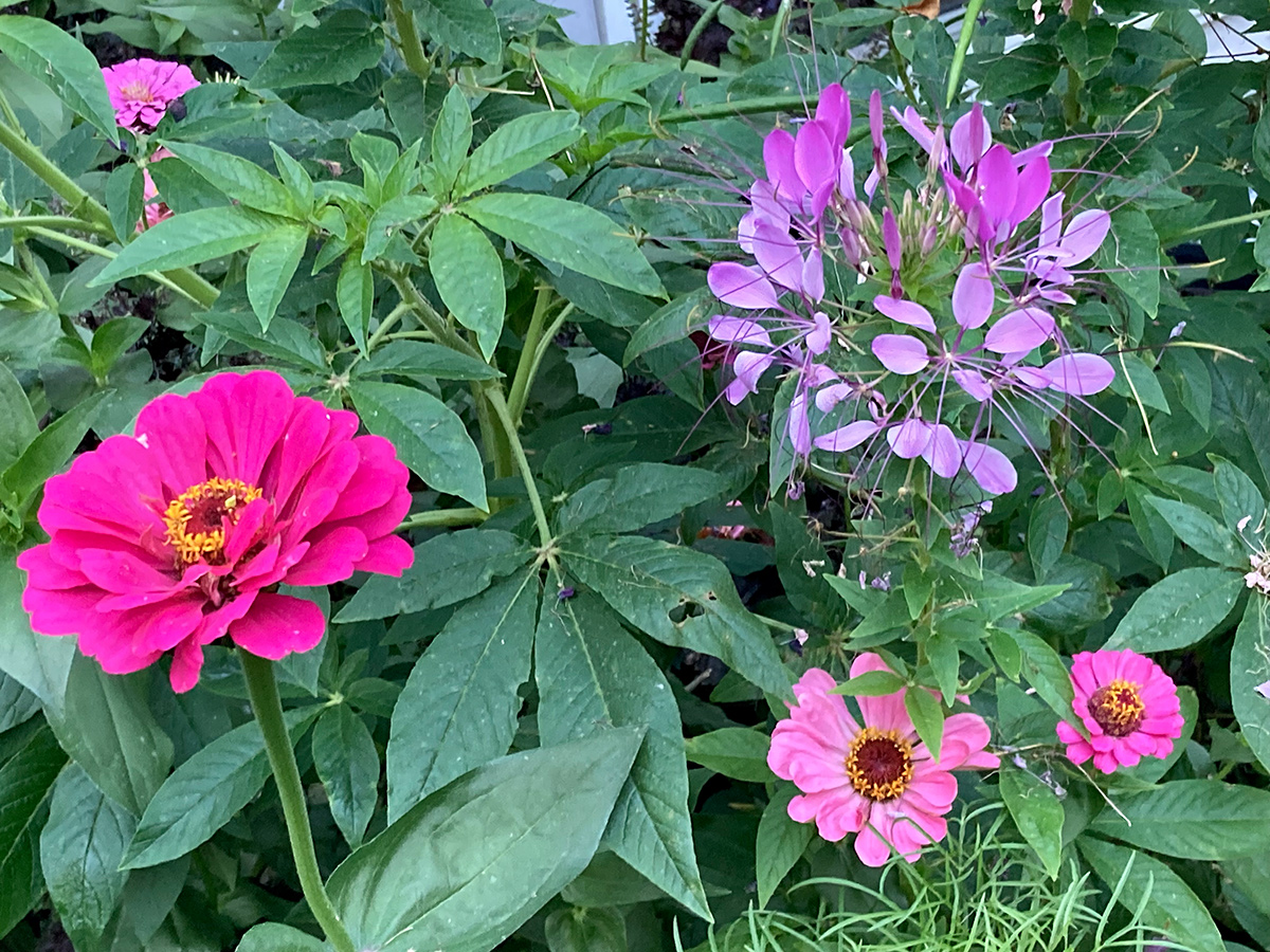 Si opta por una paleta de colores específica, mezclar y combinar las mismas plantas anuales en varios colores es una manera fácil de crear un diseño cohesivo que siga siendo emocionante. Aquí, las zinnias rosadas se combinan con crisantemos rosados; Heidi también tiene variedades blancas de ambas plantas.