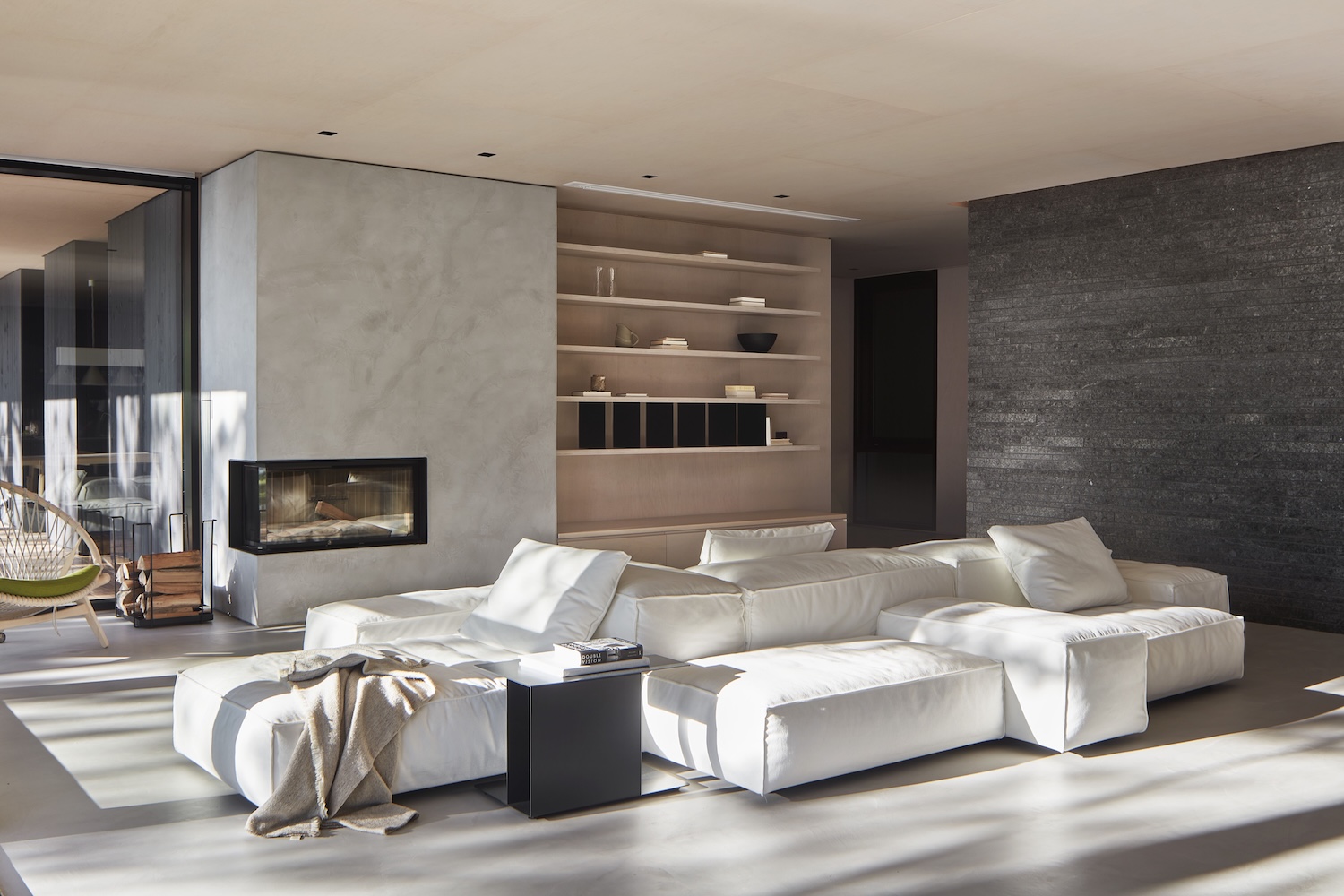 La paleta de colores terrosos (madera, hormigón, metal, piedra) se realza con detalles meticulosos, que incluyen carpintería de galleta personalizada que elimina los huecos y sujetadores visibles de las paredes de madera contrachapada, pisos de microcemento aplicados con llana a mano y un tragaluz de pared a pared que ilumina un corredor central oculto. Una pared central de granito negro divide los espacios públicos en ambos pisos para formar una sola entidad, con juntas de lechada verticales al ras y juntas horizontales en ángulo que enfatizan la linealidad y evocan las estrías en capas de formaciones rocosas naturales, con su fisicalidad reflejando los afloramientos naturales del lecho rocoso visibles a través de las ventanas de altura completa.