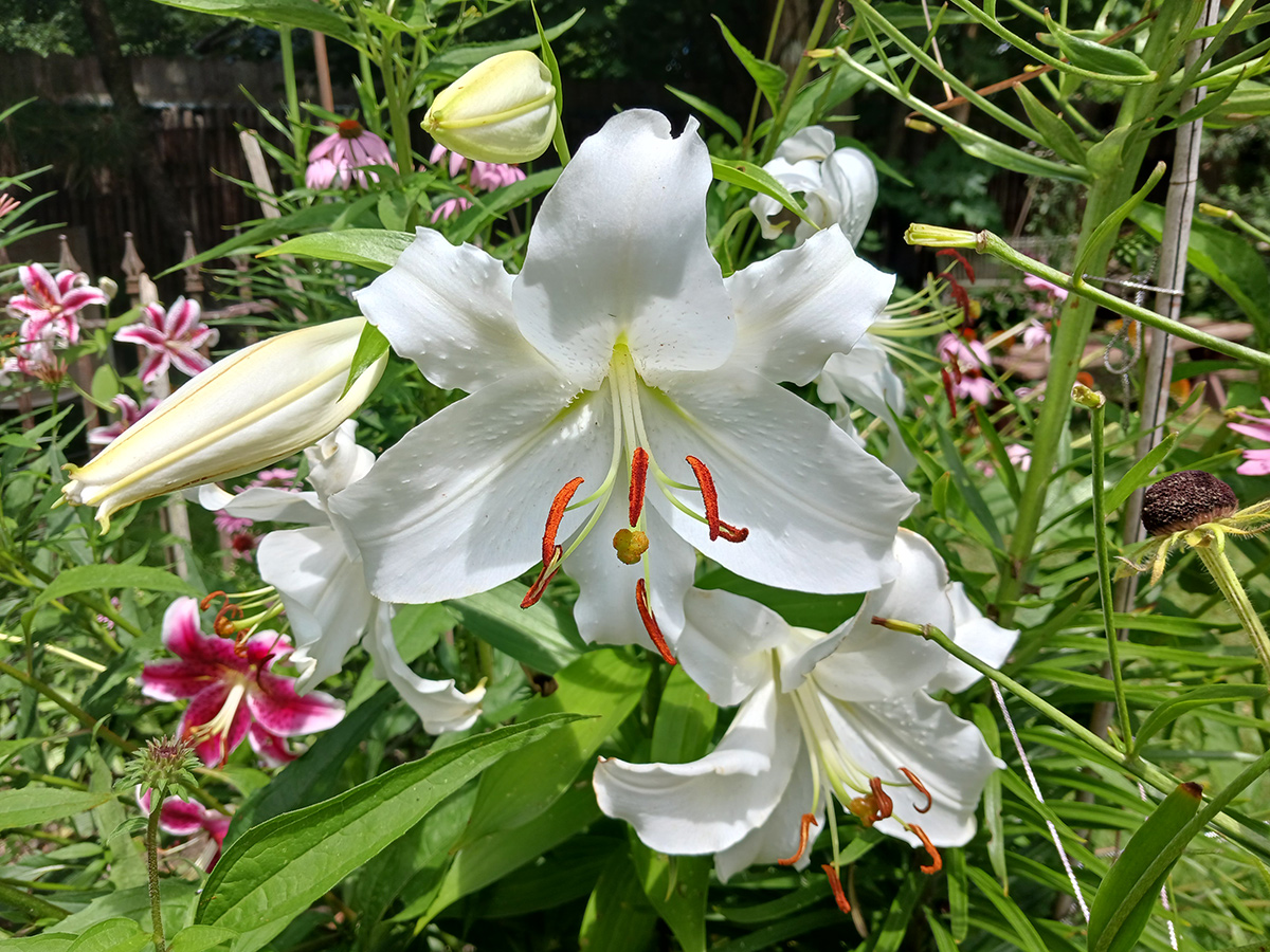 lirio blancoUna mezcla de lirios rosados ​​y equináceas hacen que este lirio blanco brillante ‘Casa Blanca’ (lirio «Casa Blanca» (zonas 5-8) se destaca entre la multitud.