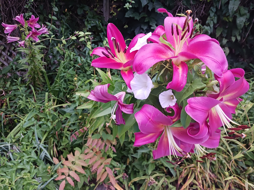 Lirios de color rosa brillanteHemos visto flores mezcladas, pero esta combinación lo lleva al siguiente nivel. Lirio rosa vibrante, probablemente cultivar ‘Robina’ (lirio ‘Robina’, zonas 4-9), sirve de soporte para las campanillas blancas (batata tres coloresanual) que crece alrededor de sus tallos y flores más grandes. ¡Lee creó un ramo viviente en su jardín!