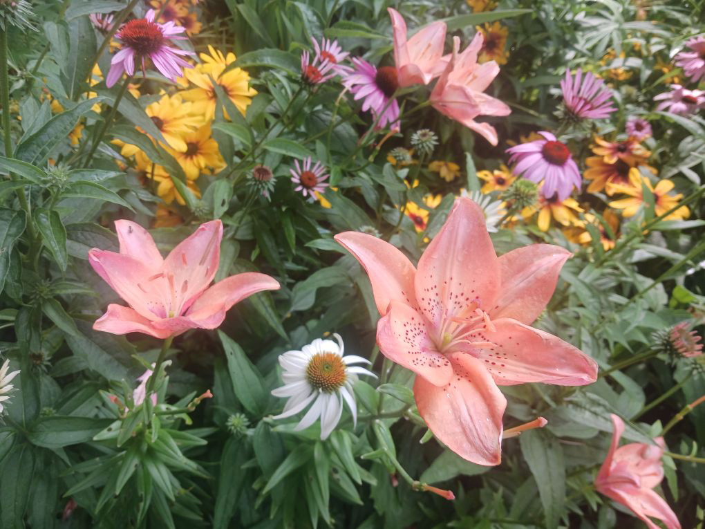 Varias flores de veranoOtro gran ejemplo de Lee creando un efecto de pradera mediante una plantación densa: lirios de color rosa melocotón, probablemente el cultivar ‘Morpho Pink’ (lirio «Morpho Pink», zonas 3-8) es el puente perfecto entre los dos equinácea morada (Equinácea moradazonas 3-9) y Susan de ojos negros (equinácea peludoregiones 3-9).