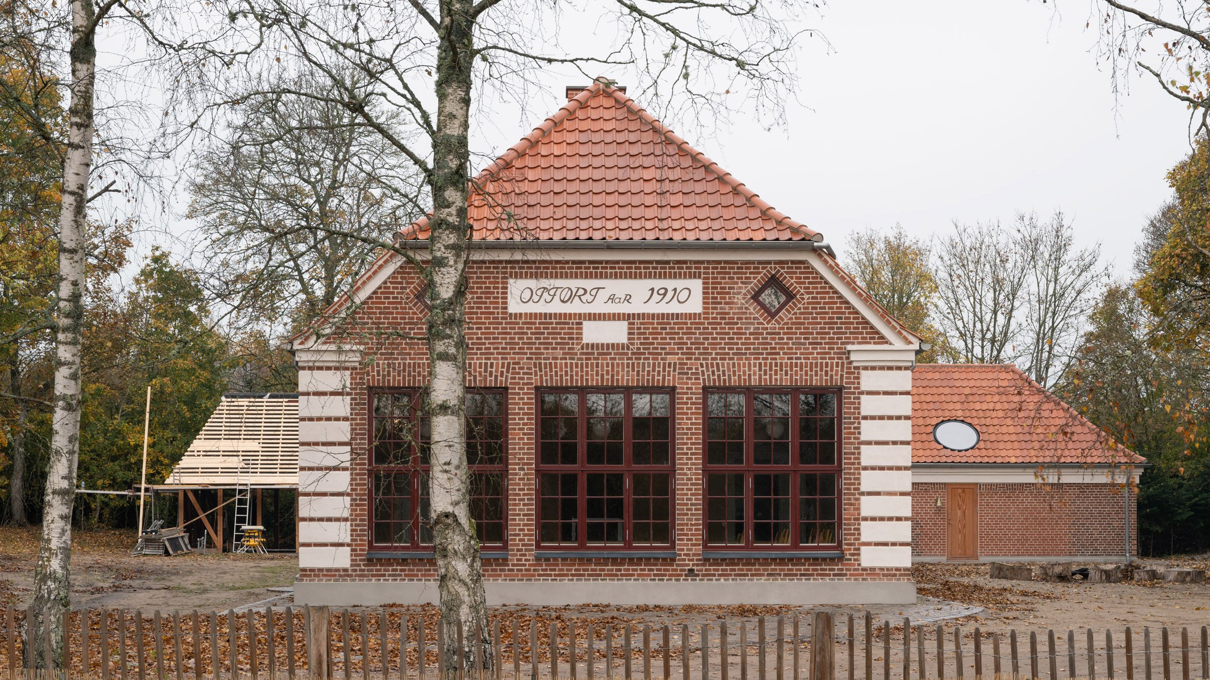 La estructura de madera de ambos edificios tiene un acabado en un color rojo intenso, una característica tradicional de muchos graneros agrícolas daneses, mientras que las grandes ventanas redondas y los tragaluces crean un tema que reúne elementos antiguos y nuevos del sitio.