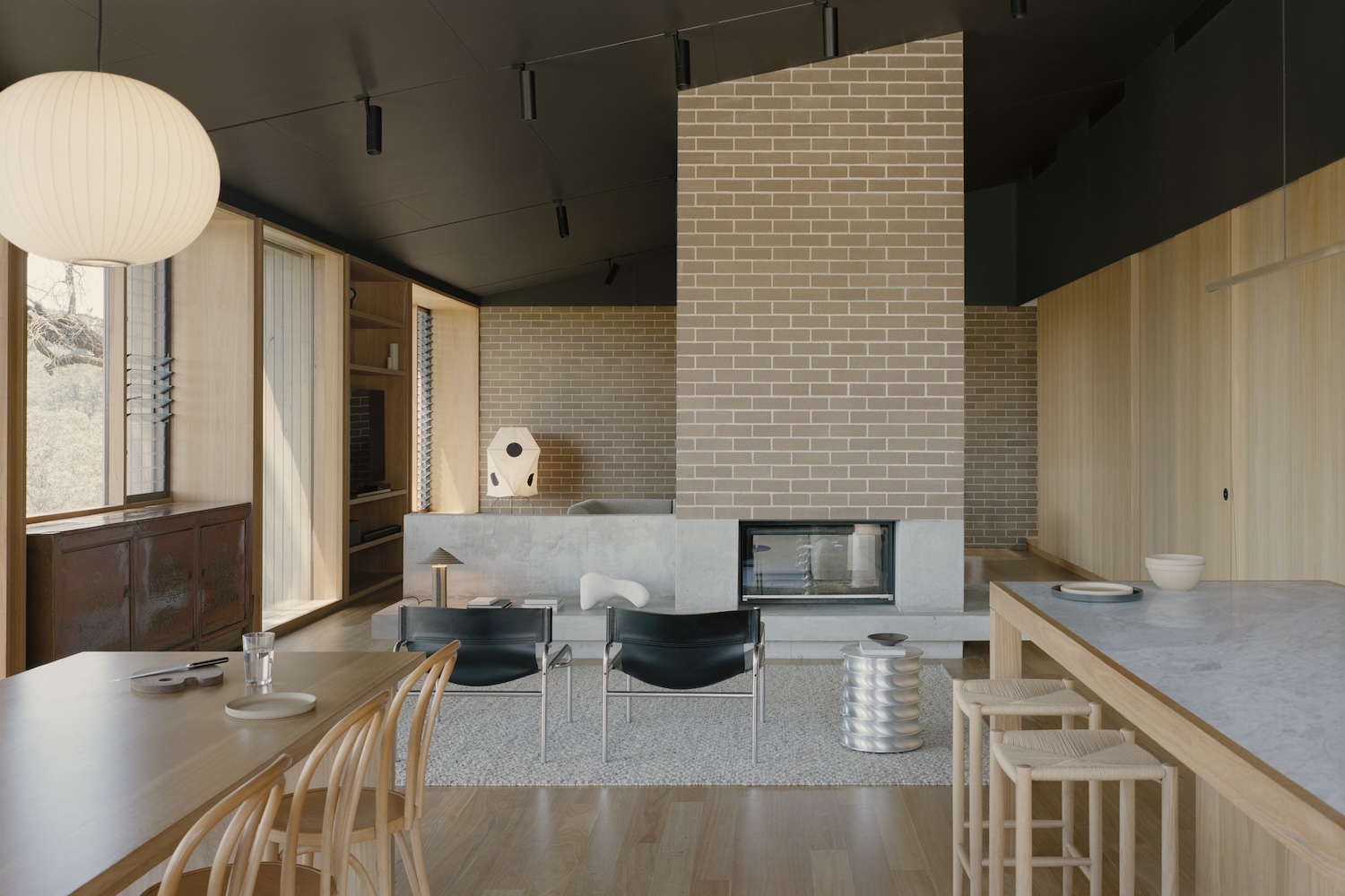 La forma prismática rectangular principal con un techo revestido de metal de color carbón hace referencia a los cobertizos de maquinaria agrícola que prevalecen en el área, lo que demuestra sensibilidad ambiental a través de la abstracción del tipo de edificio vernáculo en lugar de una replicación estilística. Esta forma está incrustada en la cresta con una base de mampostería de tierra que forma la base del nivel inferior y está acompañada por dos estructuras de ladrillo más pequeñas orientadas al norte que sirven como pabellones auxiliares de la residencia principal. Las referencias agrícolas demuestran cómo el diseño residencial contemporáneo puede incorporar tradiciones arquitectónicas regionales sin parecer derivado.