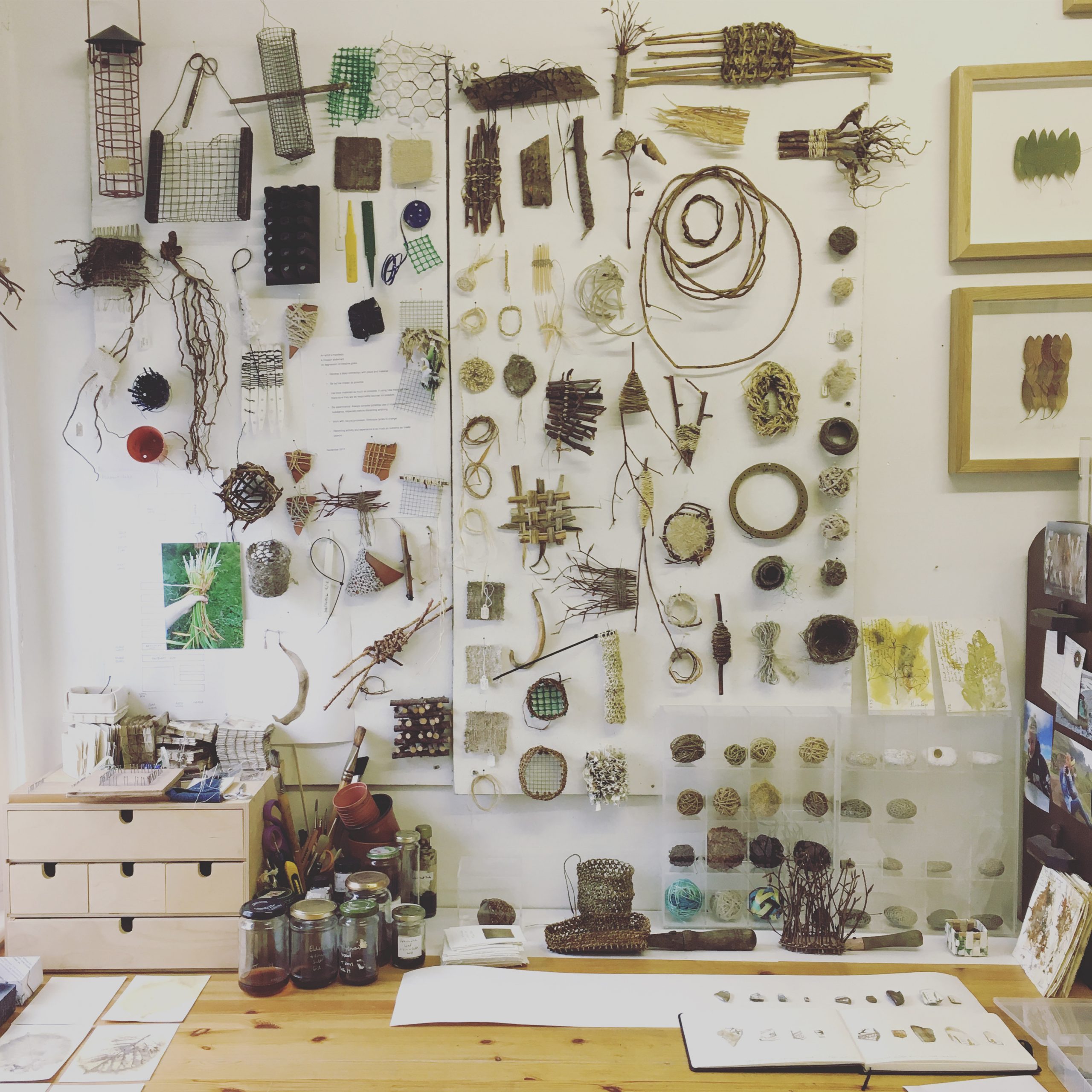 Arriba: … «Pero mire por la ventana del cobertizo principal y su atención se verá atraída por la colección cuidadosamente organizada de vasijas, bandejas, herramientas, botes de tinta vegetal casera, bocetos, garabatos, muestras, fragmentos de cerámica, alambres, plásticos y otros artículos desenterrados, así como una variedad en constante cambio de fibras vegetales en diversas etapas de secado y procesamiento manual». Visita el pequeño estudio de tejido de Alice’s Garden Visita del artista: Alice Fox’s Garden, lote 105, West Yorkshire, Reino Unido. Fotografía: Alice Fox.