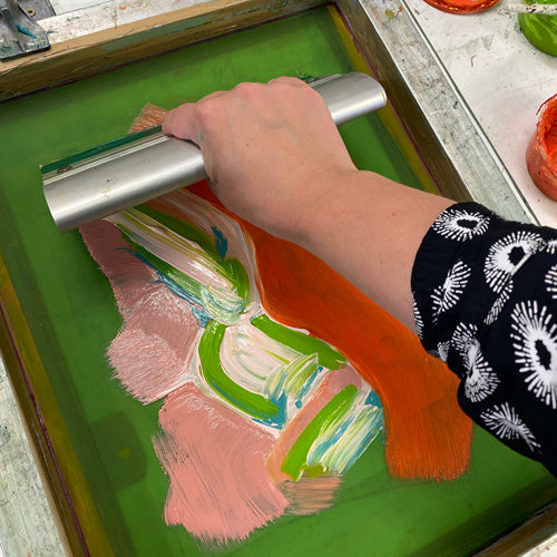 Yo (Bridget) tuve la suerte de asistir al evento del año pasado. Boceto de serigrafía simple Taller con Tricia Johnson. En el curso trabajamos con modelos naturales para crear serigrafías pictóricas utilizando el método de pantalla monocromática. Usamos tintas de serigrafía a base de acrílico y pintamos directamente sobre la cuadrícula usando una variedad de pinceles.