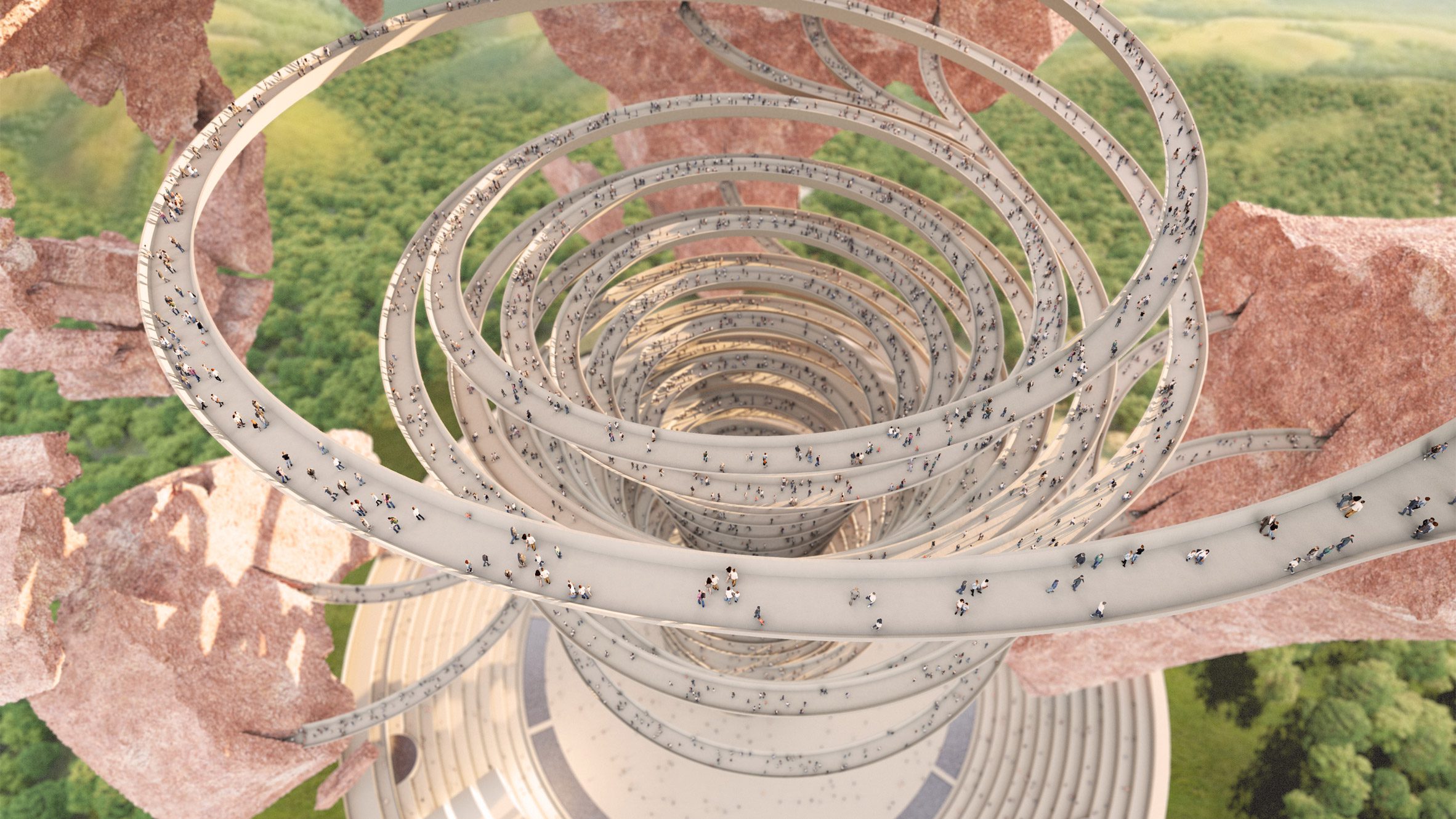 La pieza central del anfiteatro es una estructura en forma de espiral que contiene una galería de artefactos robados, diseñada como una rampa abstracta dividida en áreas dedicadas a diferentes regiones del mundo.