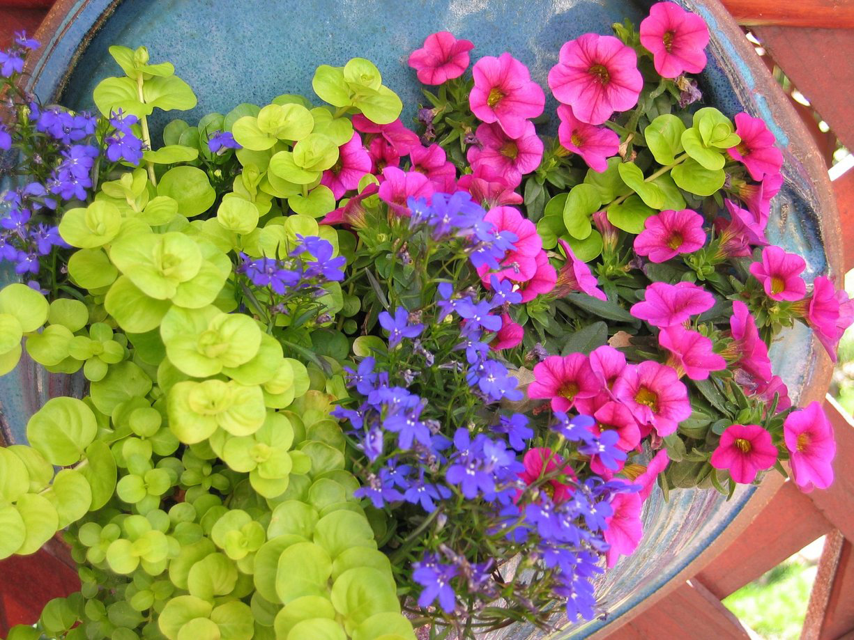 Leslie pudo agregar más plantas a su espacio mediante maceteros que colgaban de la cerca y las paredes. Esta pequeña jardinera azul llama especialmente la atención con su jenny trepadora chartreuse (Lisimaquia numerariaregiones 4–8), azul Lobeliay rosa brillante calibrajoa.
