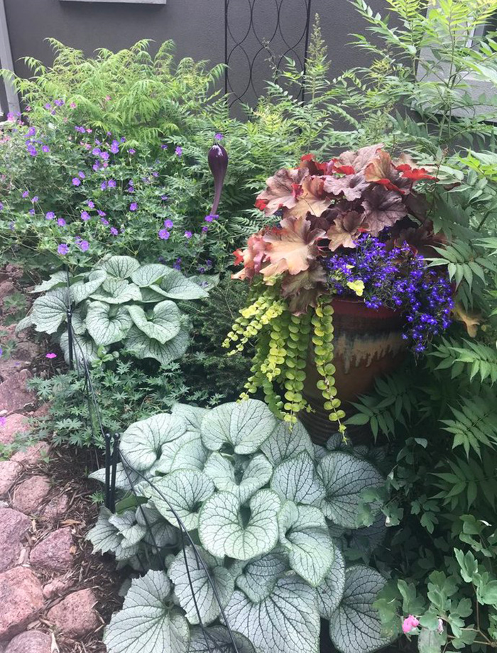 Ayer vimos muchas macetas independientes y grupos de contenedores, pero esta foto muestra a Leslie también agregando magia de contenedores a sus parterres. Esta mezcla brillante agrega un toque de calidez a plantas que de otro modo tendrían tonos fríos.