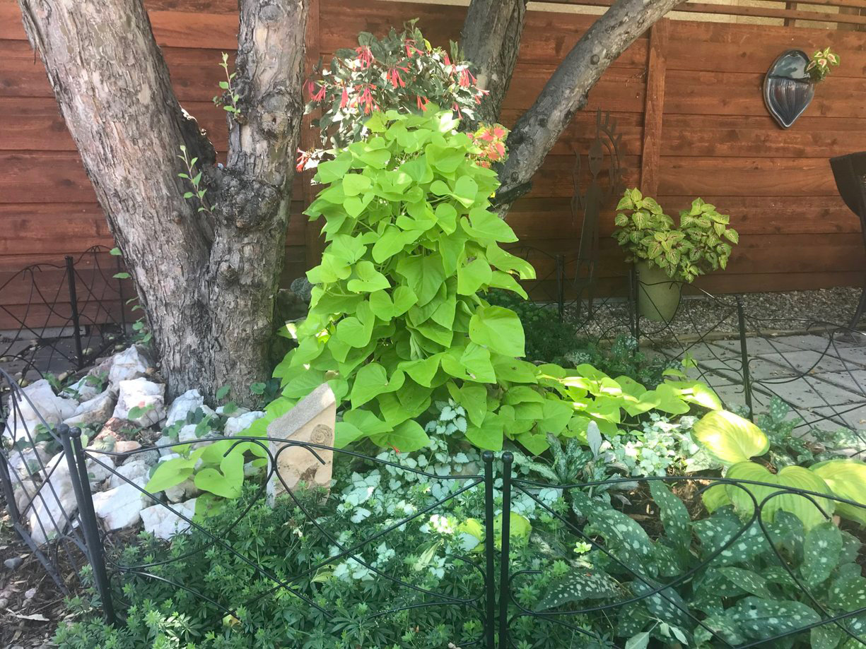 ¡Esto es lo que yo llamo un derrame! Esta enredadera de camote (camote Papazonas 9-11 o anuales) tan largas y exuberantes que a primera vista es difícil saber dónde comienza o termina la planta. Qué ilusión tan efectiva si te gusta el aspecto de las enredaderas trepando a un árbol pero quieres evitar posibles daños.