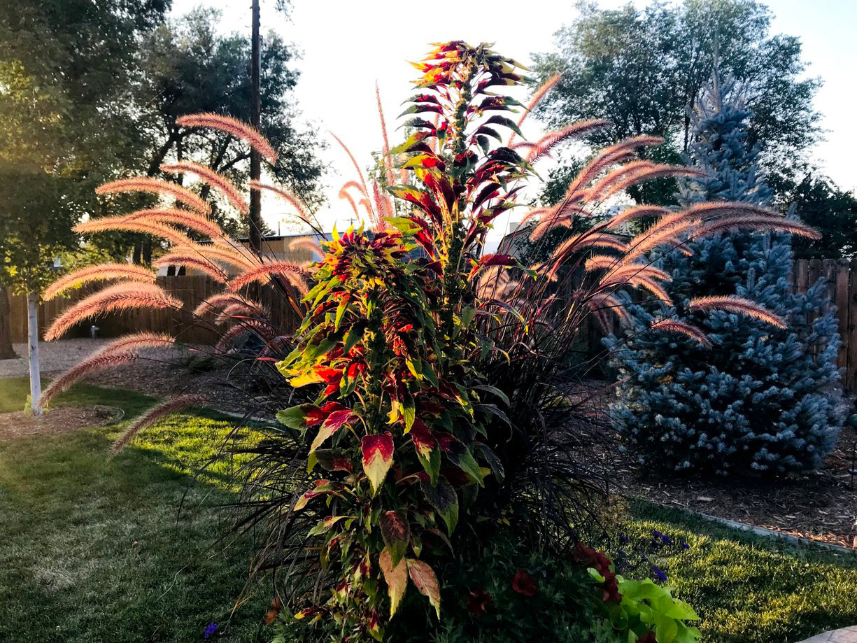 ¡Mira esta increíble olla de enfoque! Plumas de hierba fuente morada (penisetum seta ‘Rubrum’, una zona 9-10 o anual) brilla bajo la luz del sol, mientras que el colorido pelaje de Joseph (Amaranto tres coloresanual) es un caleidoscopio de colores que sale disparado desde el centro.