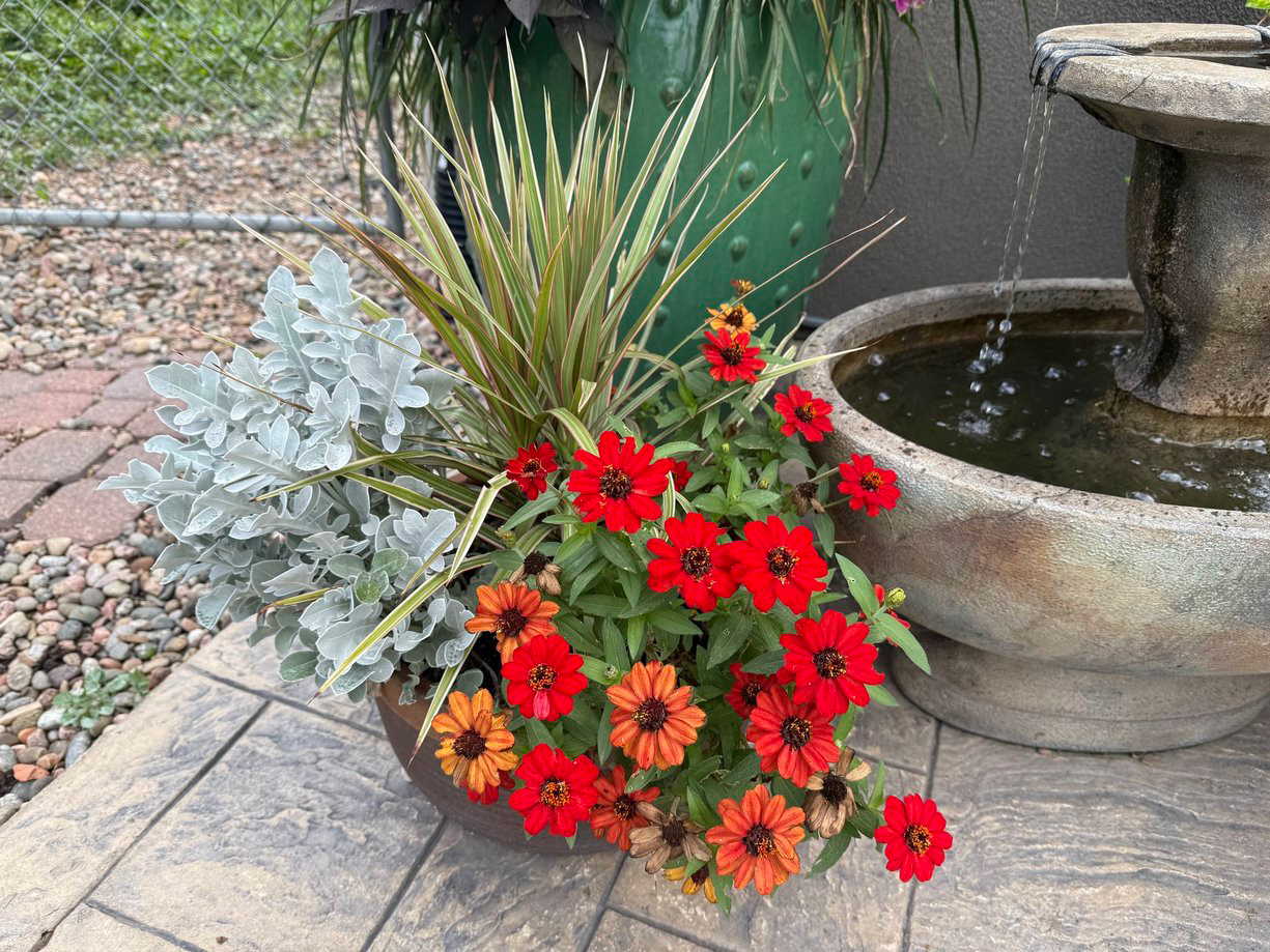 Es una impresionante combinación de fuego y hielo. Las zinnias de color rojo anaranjado contrastan maravillosamente con el polvoriento molinero de «Silver Swirl» (Florecimiento de maíz enojo ‘Balcentsirl’, zonas 6-9), mientras que Rainbow Dracaena (Árbol de serpiente Nuestro. hojas estrechas Los «Tricolores» (Distritos 10-12 o cada año) combinan los dos.
