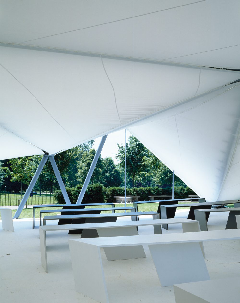 El primer pabellón de Hadid Extraordinariamente seria, es una meditación sobre el concepto de lo efímero. «La estructura de Hadid reinventa radicalmente el concepto aceptado de tienda de campaña o marquesina», explica la Serpentine Gallery en su sitio web. «Toma la forma de una estructura de techo triangular que abarca unos impresionantes 6.460 pies cuadrados (600 metros cuadrados) de espacio interno mediante el uso de una estructura principal de acero. La forma plegada de los planos angulares que se extienden hasta el suelo da la ilusión de solidez al tiempo que crea una variedad de espacios internos».