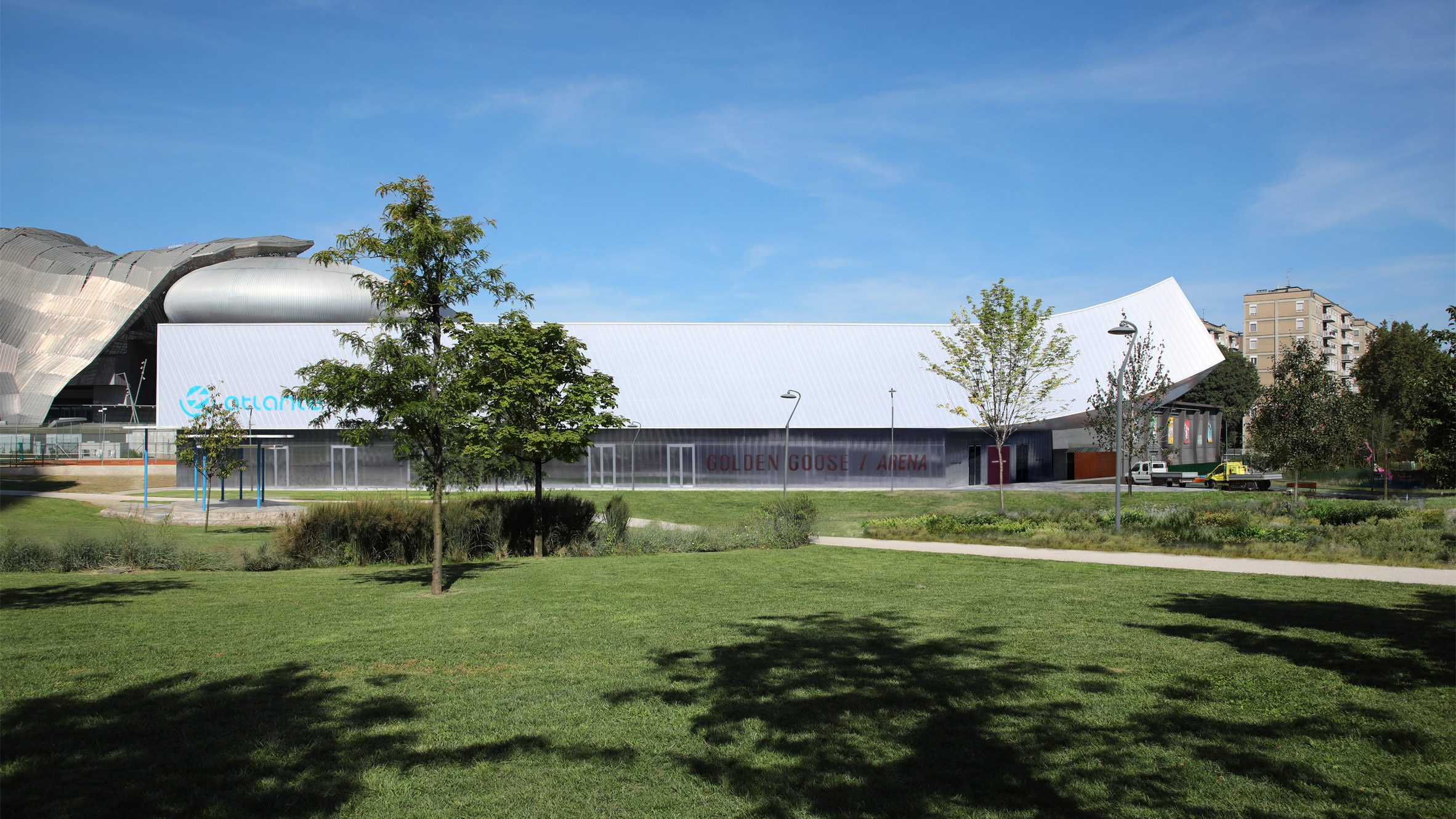 El Golden Goose Arena está ubicado en un parque en el distrito CityLife, un antiguo recinto ferial en Milán, y su forma suavemente curvada está diseñada para reflejar la forma inclinada de las torres de oficinas adyacentes CityWave. grandeactualmente en construcción.
