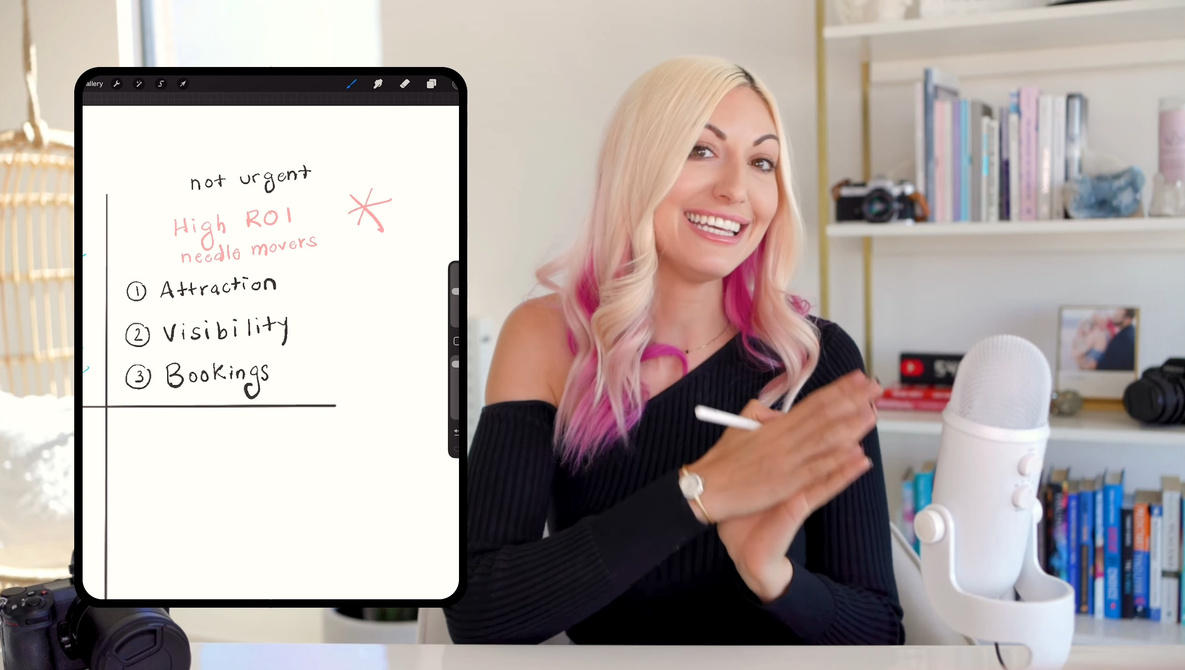 A partir de ahí, Nicole divide su enfoque de 60 días en tres pilares: tracción, reservas y visibilidad. El atractivo es cómo su cartera, su marca y sus mensajes hacen que los clientes adecuados lo vean como la opción obvia, no como un tipo más con una cámara. Su sistema de reservas cubre todo lo que sucede después de que llega una consulta, desde el tiempo de respuesta hasta lo fácil que es decir que sí y pagar. La visibilidad es el plan de presentar tu trabajo a personas que ya están buscando el contenido que grabas, ya sea en Instagram u otra plataforma que funcione para tu cliente ideal. En el video, Nicole da ejemplos de objetivos que puede establecer para cada pilar y recomienda tomarse algunas semanas seguidas para profundizar en un área mientras lanza «buenas ideas» al azar al estacionamiento para que no lo distraigan. Mire el vídeo de arriba para obtener una descripción completa de Nicole.