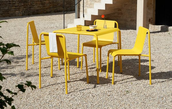 Bancos angulares de hormigón con mesas integradas se encuentran fuera de la cafetería, que ofrece vistas del río a través de la estructura de hormigón y acero de la histórica fábrica de cemento.