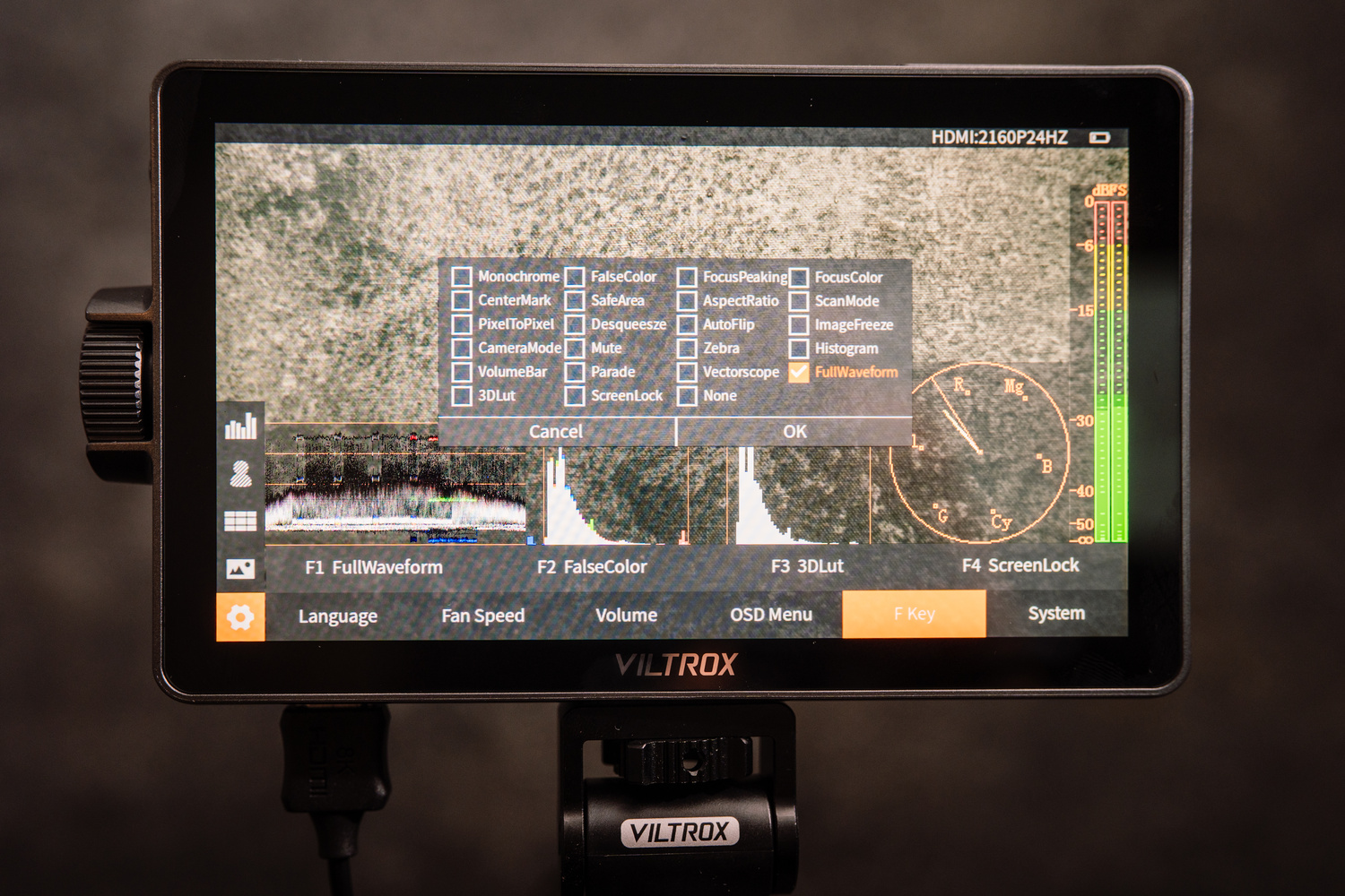 Los monitores de presupuesto tienden a quedarse cortos en esta área en comparación con las opciones de alta gama. Pero el Viiltrox DC-A1 no parece contener nada. Obtiene un vectorscopio, múltiples colas RGB y modo de forma de onda completa. ¿La mejor parte? Puede arrastrar y soltar estas herramientas en la pantalla. También hay picos de enfoque (con color y sensibilidad ajustables), dos colores falsos, patrones de cebra, marcas de seguridad, toneladas de relaciones de compresión anamórficas (¡incluso relaciones personalizadas!) y LUT 3D.