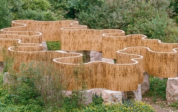 Una cubierta envolvente se extiende desde la sala de estar y sirve como plataforma al aire libre respetando los contornos naturales y la topografía cubierta de hierba del sitio.