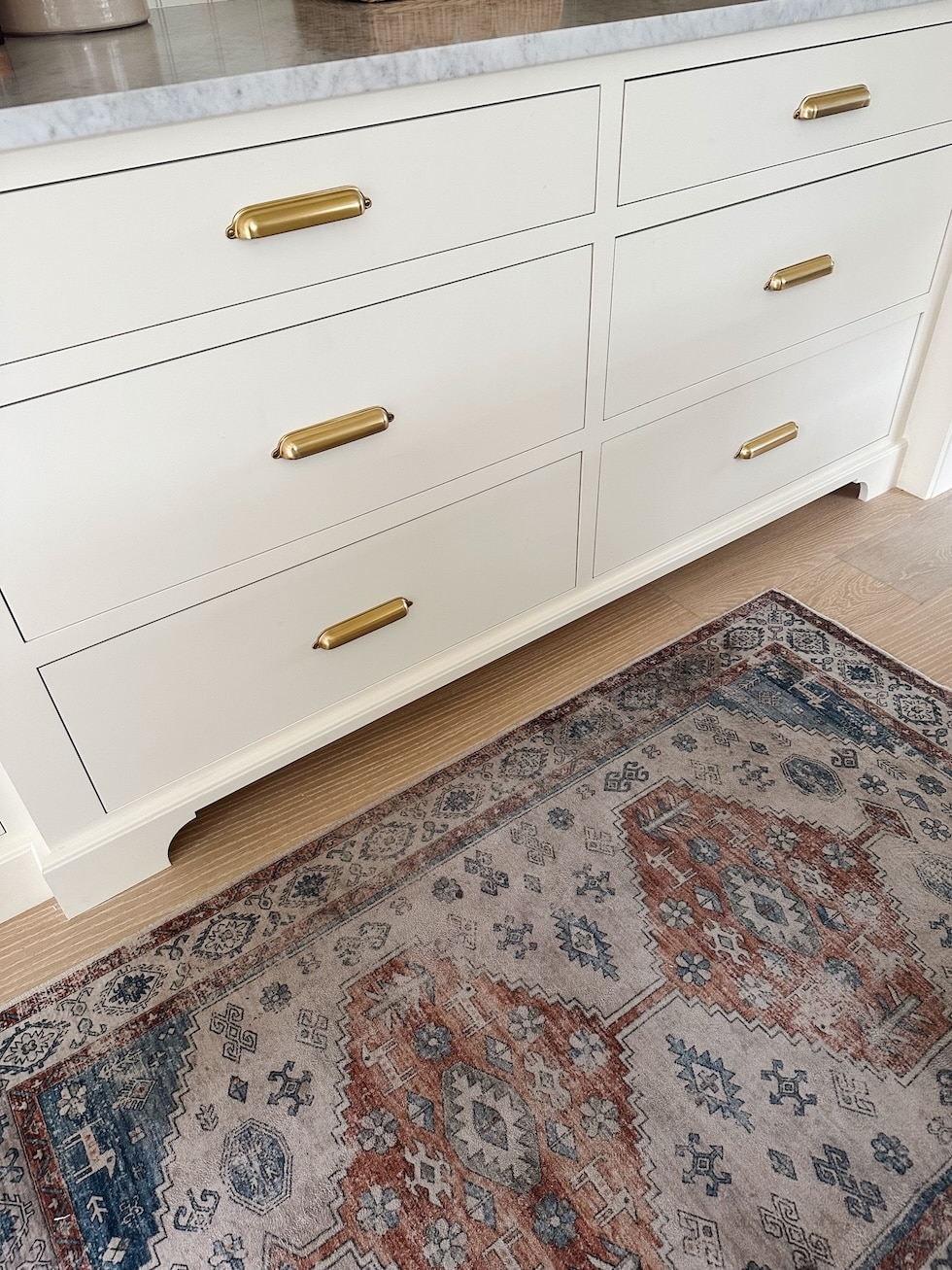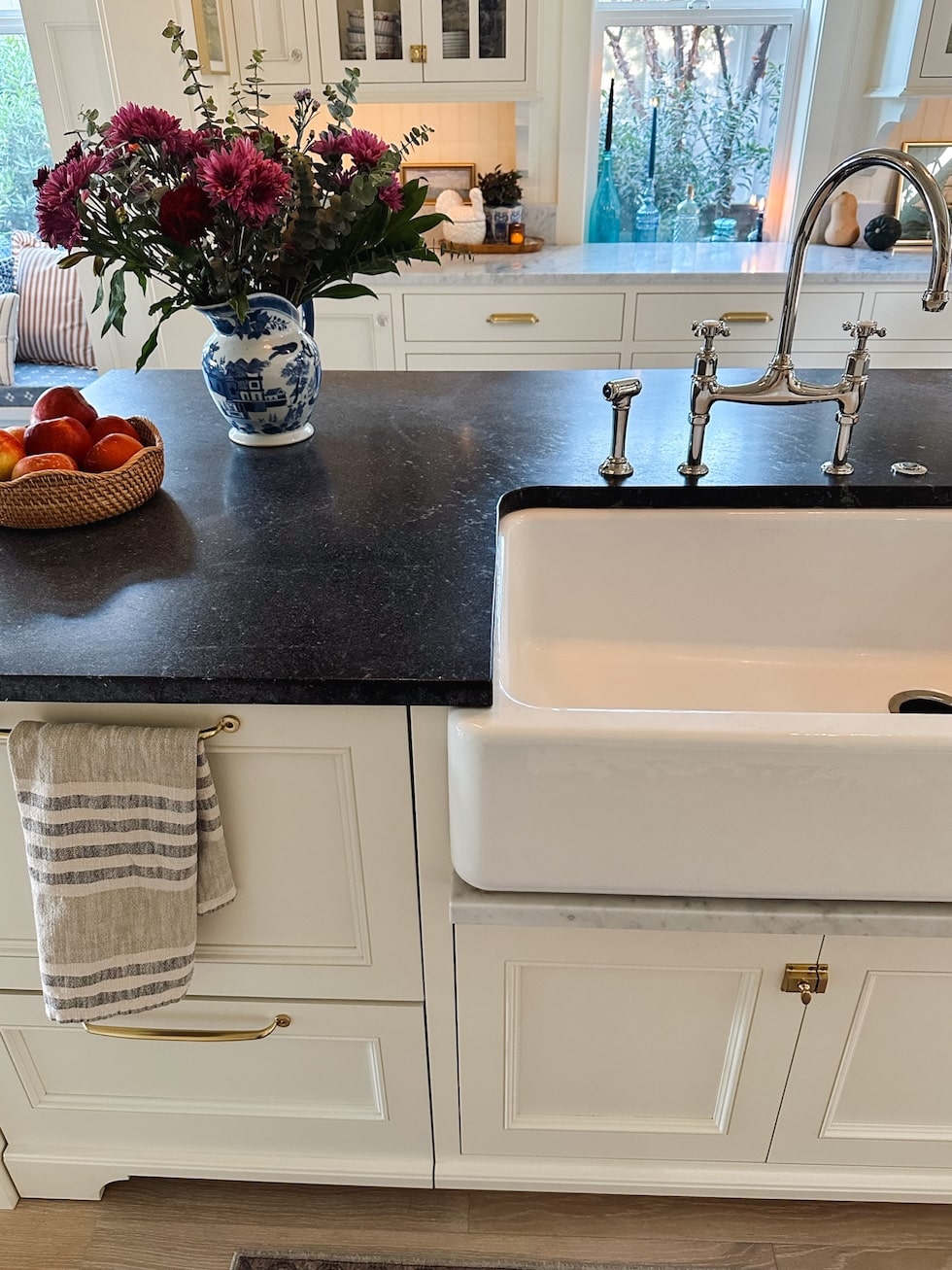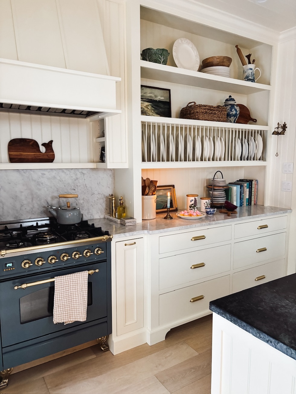 También agregamos un protector contra salpicaduras de mármol detrás de la mayoría de los mostradores y la estufa; me encanta su aspecto clásico (¡ese es el aspecto que queríamos, como si la cocina hubiera estado aquí durante años!). Me alegra que hayamos agregado este detalle de último minuto. El mármol adicional se siente bien en la habitación y se ve más limpio que simplemente calafatear alrededor del tablero.