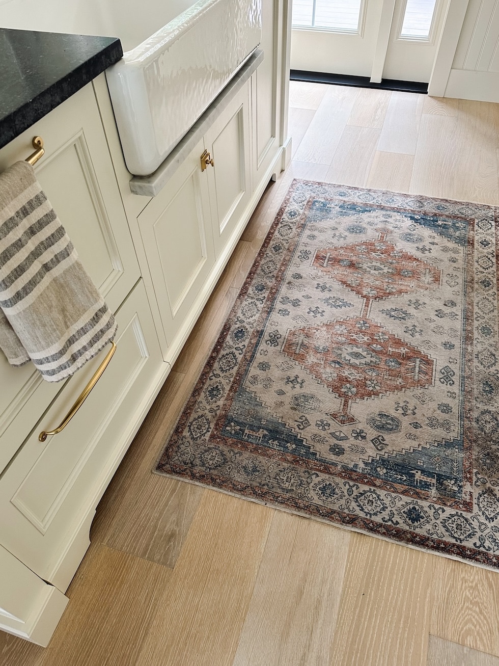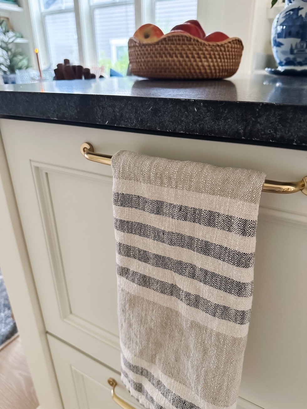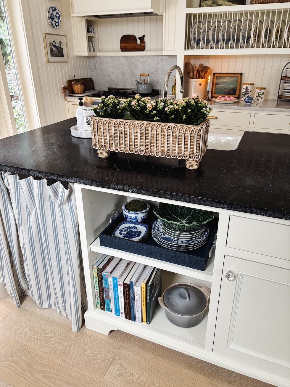 También agregamos un protector contra salpicaduras de mármol detrás de la mayoría de los mostradores y la estufa; me encanta su aspecto clásico (¡ese es el aspecto que queríamos, como si la cocina hubiera estado aquí durante años!). Me alegra que hayamos agregado este detalle de último minuto. El mármol adicional se siente bien en la habitación y se ve más limpio que simplemente calafatear alrededor del tablero.