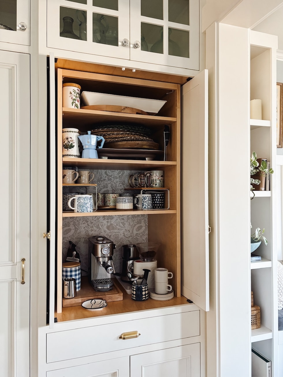 Nos encanta este gabinete que contiene artículos de café y algunos artículos de mesa en el cajón de abajo (ubicado frente a la mesa del comedor). Las puertas se deslizan completamente hacia los lados de los gabinetes para que no se peguen a la habitación.