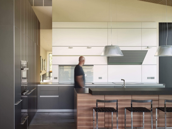 La cocina abierta abarca 700 pies cuadrados con gabinetes tricolores y encimeras de cuarzo, y está adyacente al corredor de la galería, lo que permite que el arte y la vida se conecten visualmente.